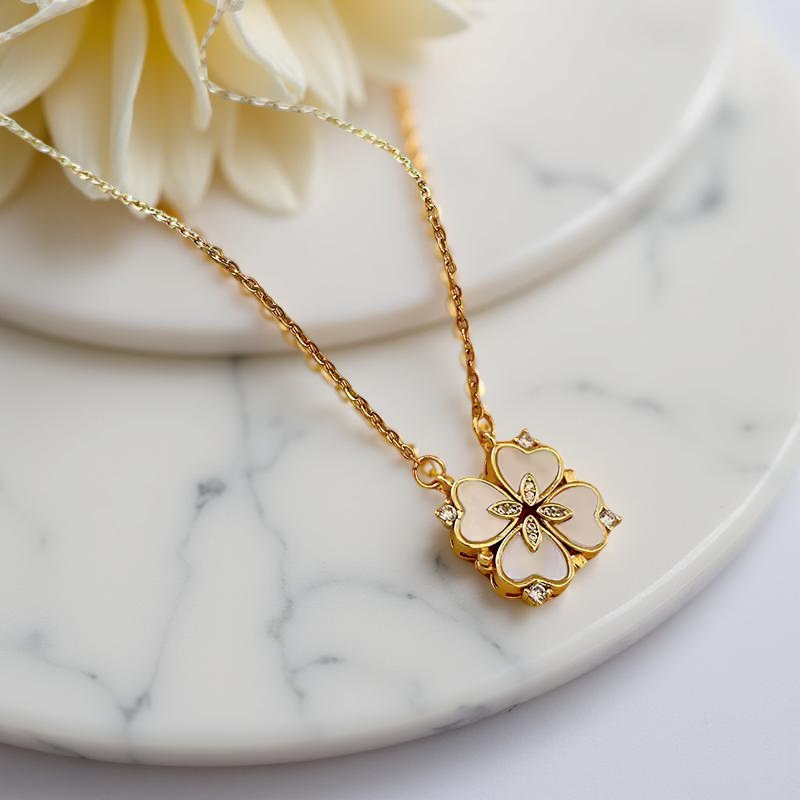 عقد أنيق بلون ذهبي مع تصميم نبتة مكونة من أربع قلوب، يرمز إلى الحب والحظ الجميل. يرتكز على شكل القلوب كعنصر أساسي، حيث تُرتّب بطرق مختلفة لتمنح مظهرين مميزين: الأول على هيئة ورقة برسيم بأربع أوراق ترمز إلى الحظ السعيد، والثاني على شكل صف أنيق من القلوب يرمز إلى المودة المستمرة. تضفي الدرجات الذهبية مع الأحجار البراقة لمسة من الفخامة، مما يحقق توازناً بين الأناقة الكلاسيكية والطابع العصري المرح.