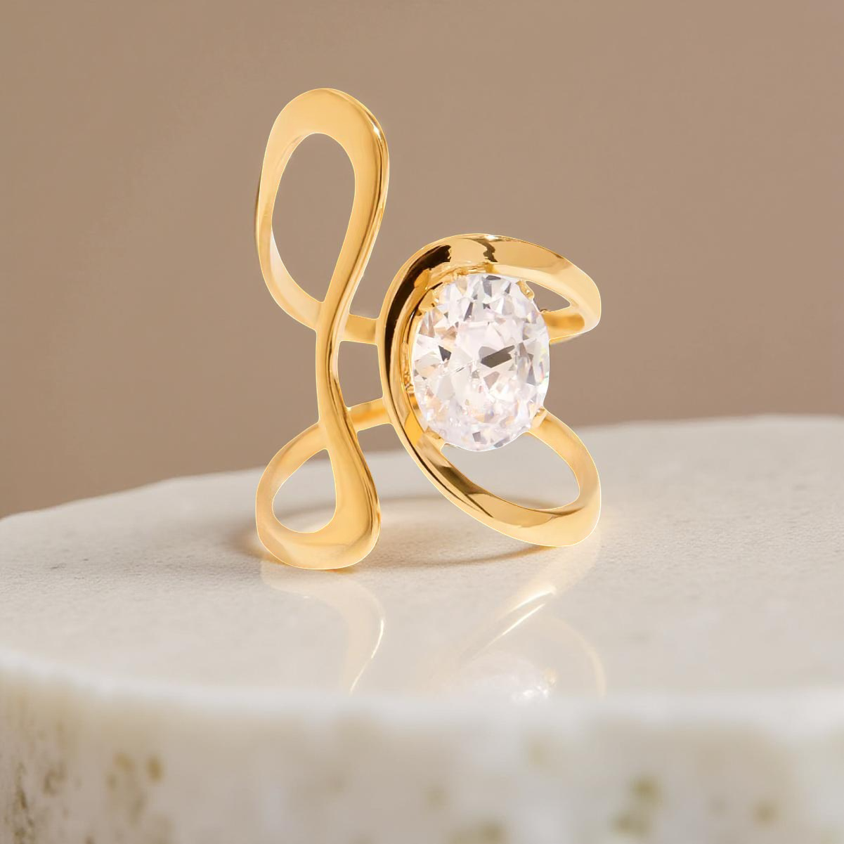 A sculptural gold-tone ring featuring an open loop design embracing a brilliant round-cut stone. Modern, graceful, and luminous.