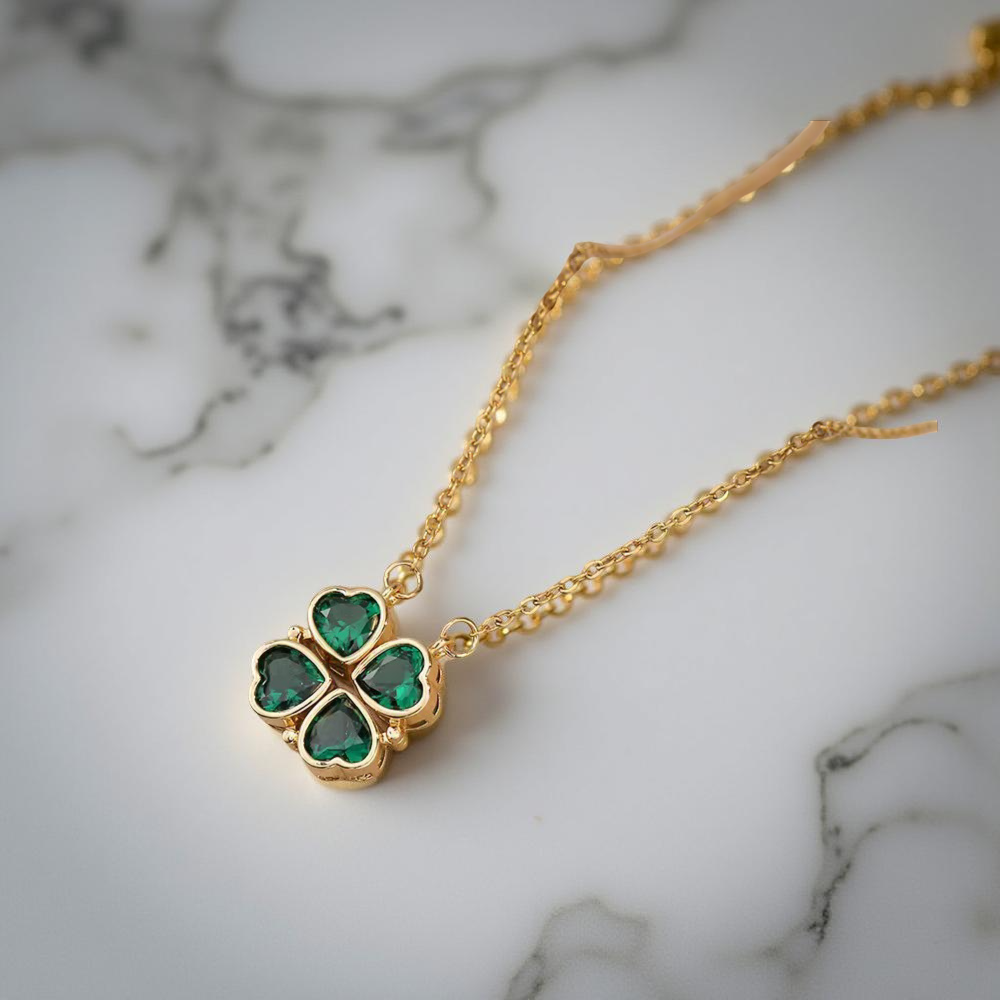 A heart-shaped floral bloom, shimmering with crystals — a symbol of delicate beauty. The design concept blends symbolism and versatility, drawing inspiration from themes of love, luck, and elegance. It uses heart shapes as the core motif, arranged in different formations to create two distinct looks—one as a harmonious four-leaf clover symbolizing good fortune, and the other as a graceful sequence of hearts representing continuous affection. The use of gold tones and sparkling stones elevates the design, balancing timeless sophistication with a modern, playful touch.