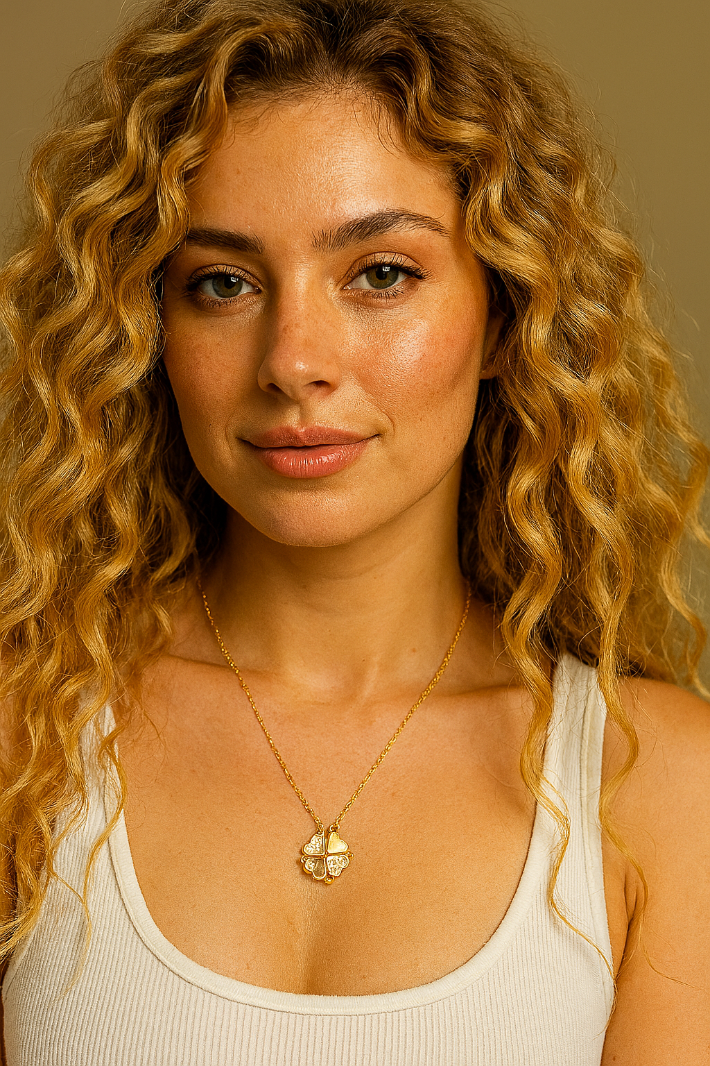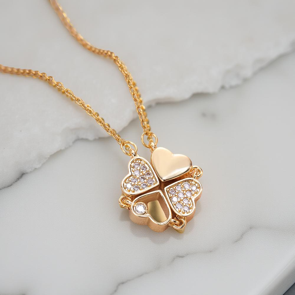 قلادة على شكل قلب مفتوح مرصعة بالكريستال اللامع، جريئة وأنيقة.  يرتكز على شكل القلوب كعنصر أساسي، حيث تُرتّب بطرق مختلفة لتمنح مظهرين مميزين: الأول على هيئة ورقة برسيم بأربع أوراق ترمز إلى الحظ السعيد، والثاني على شكل صف أنيق من القلوب يرمز إلى المودة المستمرة. تضفي الدرجات الذهبية مع الأحجار البراقة لمسة من الفخامة، مما يحقق توازناً بين الأناقة الكلاسيكية والطابع العصري المرح.