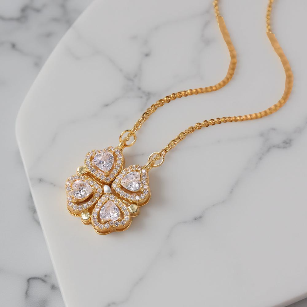 A heart wrapped in a ribbon of gold and sparkles — a sweet gesture of love and care. The design concept blends symbolism and versatility, drawing inspiration from themes of love, luck, and elegance. It uses heart shapes as the core motif, arranged in different formations to create two distinct looks—one as a harmonious four-leaf clover symbolizing good fortune, and the other as a graceful sequence of hearts representing continuous affection. The use of gold tones and sparkling stones elevates the design, balancing timeless sophistication with a modern, playful touch.