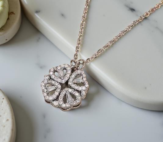 قلوب خفيفة تتراقص على سلسلة فضية، تهمس بالحركة والمشاعر. يرتكز على شكل القلوب كعنصر أساسي، حيث تُرتّب بطرق مختلفة لتمنح مظهرين مميزين: الأول على هيئة ورقة برسيم بأربع أوراق ترمز إلى الحظ السعيد، والثاني على شكل صف أنيق من القلوب يرمز إلى المودة المستمرة. تضفي الدرجات الذهبية مع الأحجار البراقة لمسة من الفخامة، مما يحقق توازناً بين الأناقة الكلاسيكية والطابع العصري المرح.